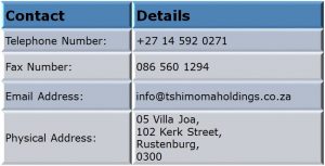 Contact Us Contact Form Your Name (required) Your Company (required) Your Number (required) Your Email (required) Subject Your Message Our Contact Details Tshimoma-website-terms-and-conditions Home | About Us | Our Business